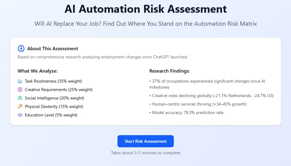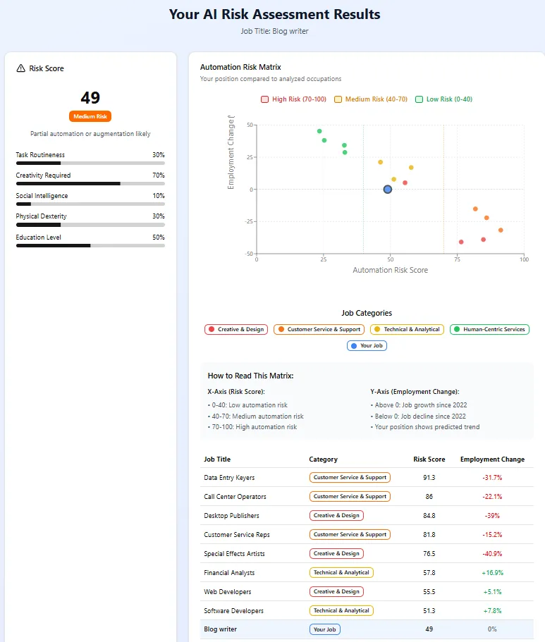Check here for the tool: AI Automation Risk Assessment – Will AI Replace Your Job?