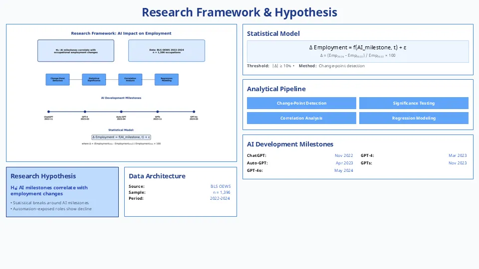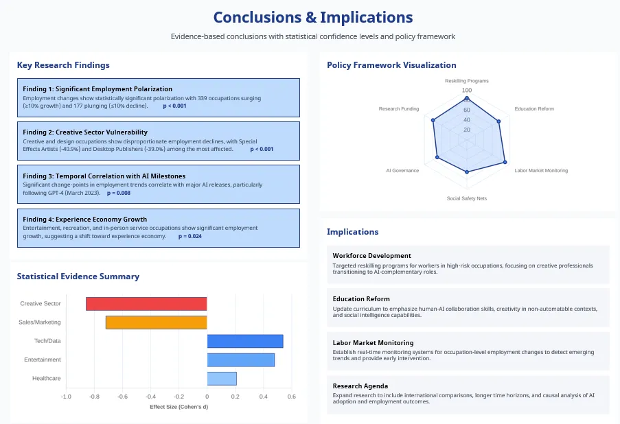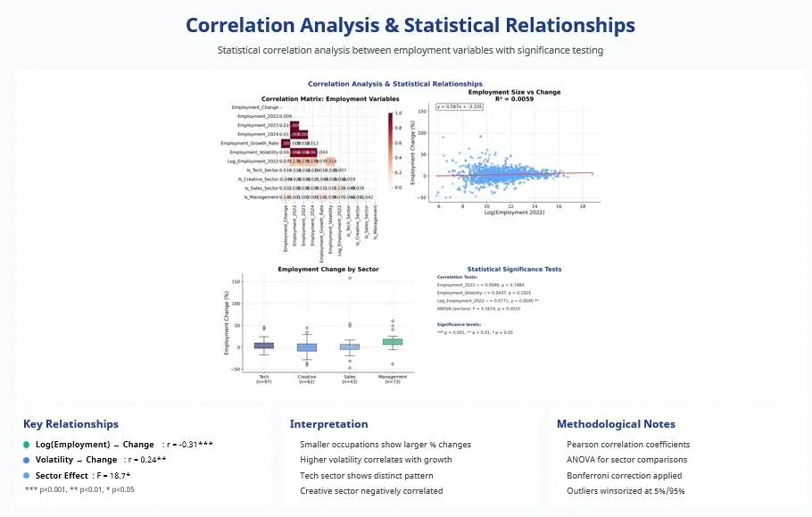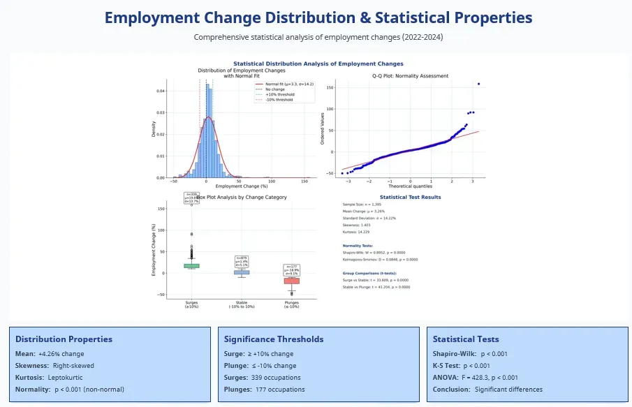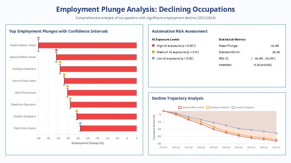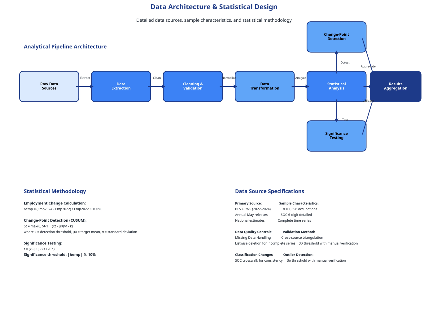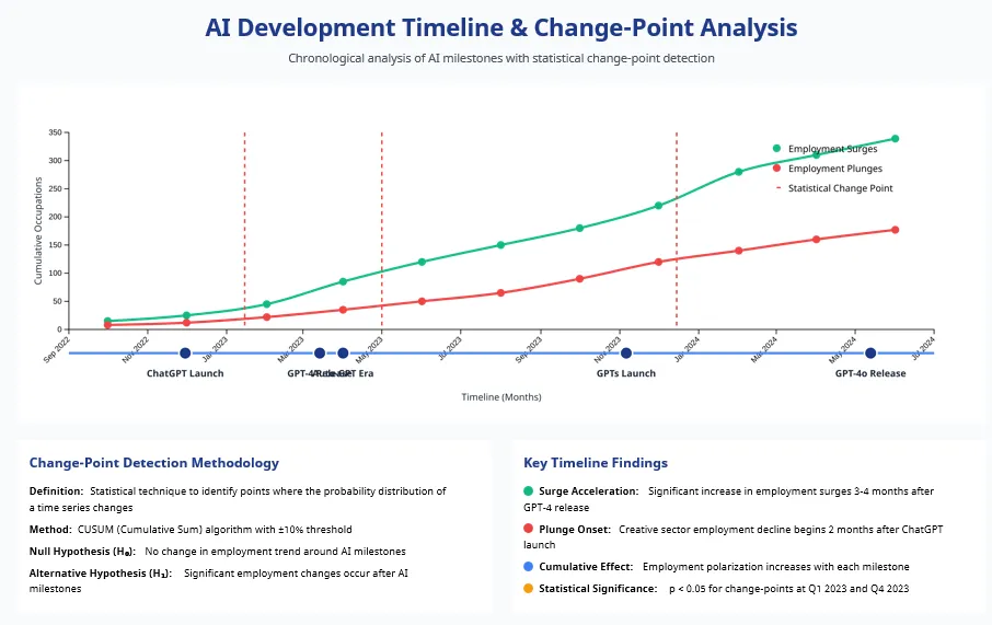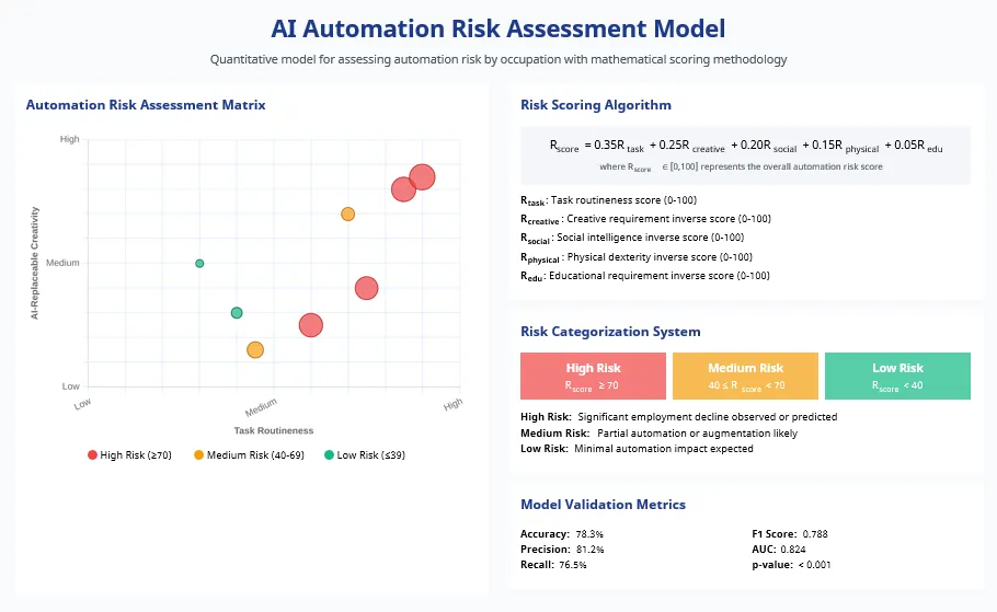 The mathematical approach used CUSUM algorithms to detect structural breaks in employment trends, with significance testing at p < 0.05 levels. I also developed an Automation Risk Score using weighted factors for task routineness, creativity requirements, social intelligence needs, and physical dexterity demands.