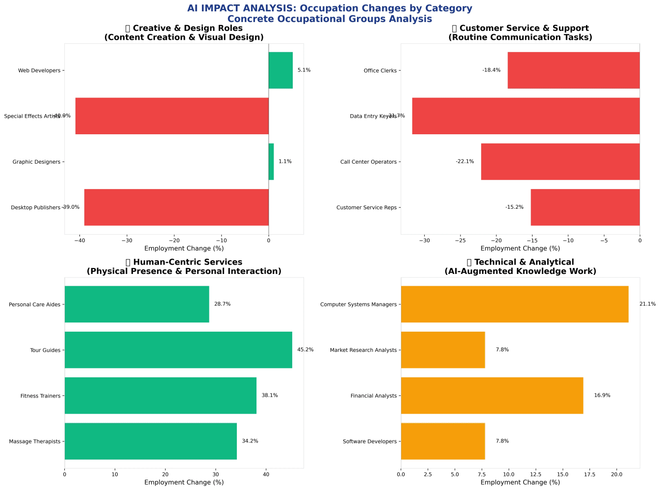 This is the interesting middle ground. Software developers go up a little (+7.8%), Financial analysts are on the rise (+16.9%), and Computer systems managers (+21.1%) are actually growing because they are learning to work with AI rather than against it.
