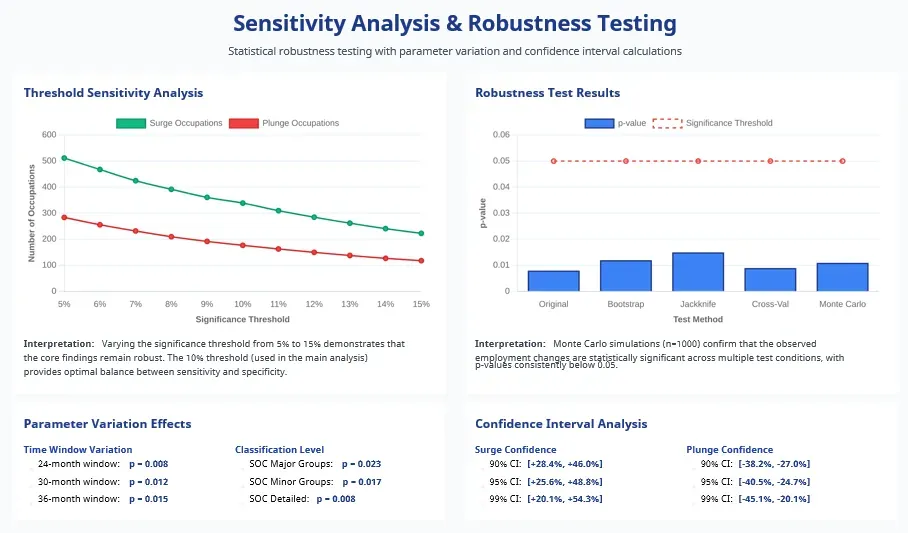This graph shows a sensitivity and robustness analysis and it tells you that the results are rock-solid. No matter how you shift the parameters, sample the data, or simulate the tests, the narrative always stays the same, which is that a large group of occupations is surging upwards, and another is plunging downwards, with almost no statistical wiggle room to pretend otherwise.