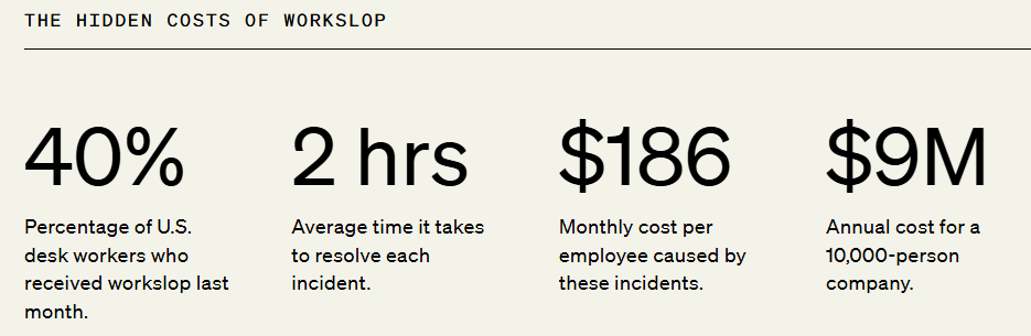 They calculated that those 1 hour and 56 minutes spent fixing each others’ workslop costs about $186 per worker per month. For a company of 10,000 people that has just invested 400 pop a head in AI, that’s over $9 million a year in lost productivity.