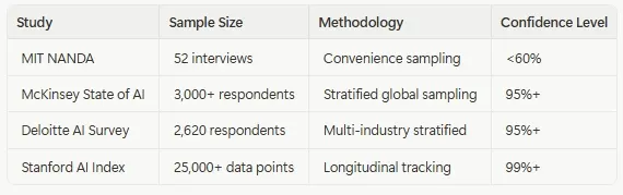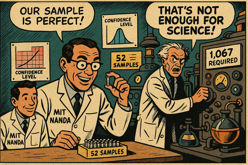 Here’s where the math finally buries the myth. MIT’s State of AI in Business 2025 implodes under statistical malpractice. With only 52 interviews, their 95% confidence interval for a 95% failure rate stretches from 82.3% to 99.7%, with a margin of error of ±8.7% and statistical power of 0.23 and that is roughly as reliable as flipping a coin in a thunderstorm.