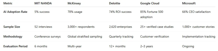 These are production systems, people, and NOT demo projects. So unless every major consultancy and Fortune 500 firm collectively hallucinated their ROI, MIT NANDA PROPAGANDA’s six-month, 52-interview “study” was measuring nothing more than echo.