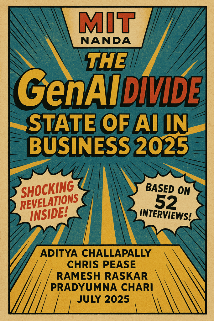 It was Friday morning, I woke up, turned on the light, and the first thing I always do is switch on Flipboard (an interactive magazine) to see what news I have missed from the night before, because you never know. . . And that particular night before, MIT NANDA† launched “The GenAI Divide: State of AI in Business 2025”. It took me a full hour of professional procrastination (scrolling) before I remembered I was supposed to be vertical. And then I spent 15 minutes under the shower wondering if I should update my LinkedIn to “Professional Disappointment Consultant” and call it a day.