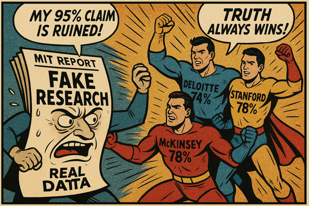 If this were a PhD thesis, it’d be a case study in haste, hubris, and headline addiction. A valid study needs 1,000+ enterprises, 24 months, and both quantitative and qualitative data. But MIT delivered a statistical Happy Meal. It is quick, greasy, and just engineered for clicks and their advertisers. The real state of AI is an ecosystem mid-growth, still finding its balance. So, MIT didn’t measure collapse, but they measured impatience instead.