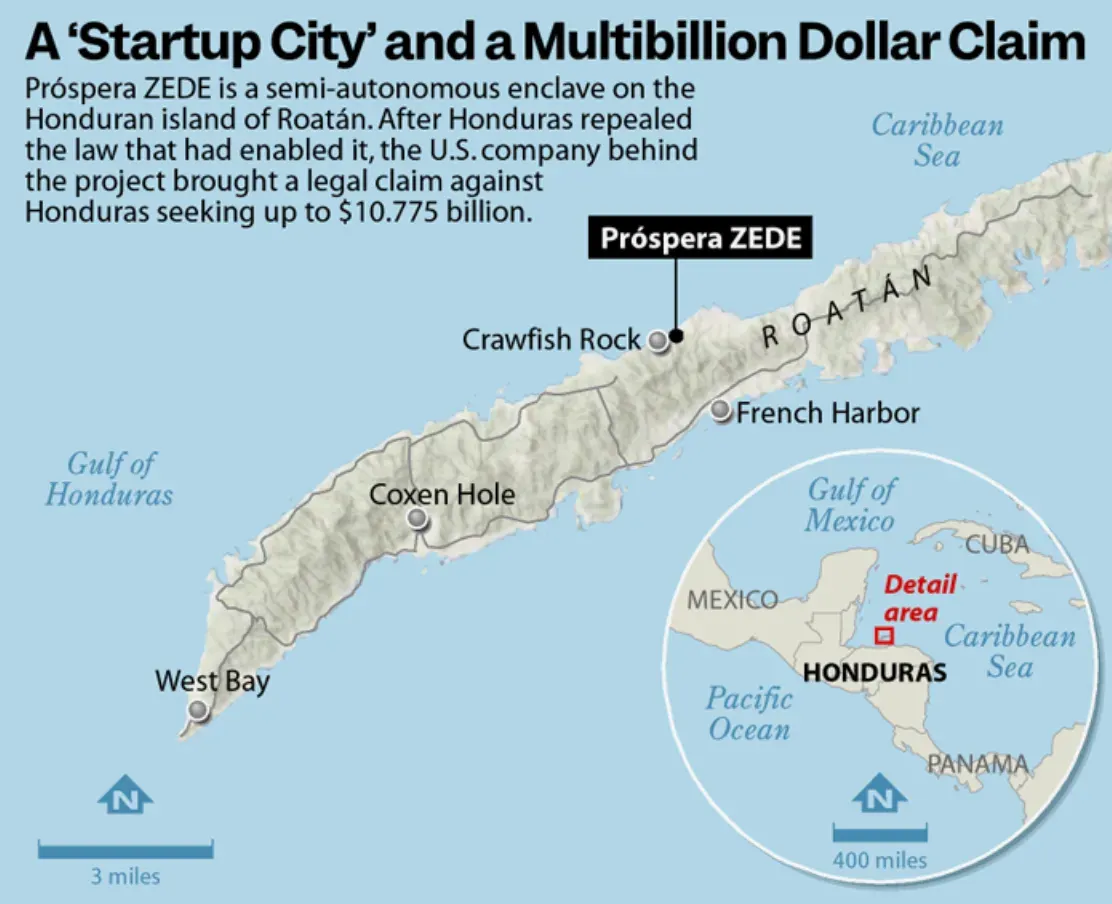 When the ZEDE law was repealed in 2022, Honduras tried to shut the project down. But Prospera’s lawyers were armed with international arbitration treaties and the full confidence of white-collar immortality, and they fought back. They claimed contractual rights for 50 years of autonomy, enforced by treaties signed under the previous regime.
