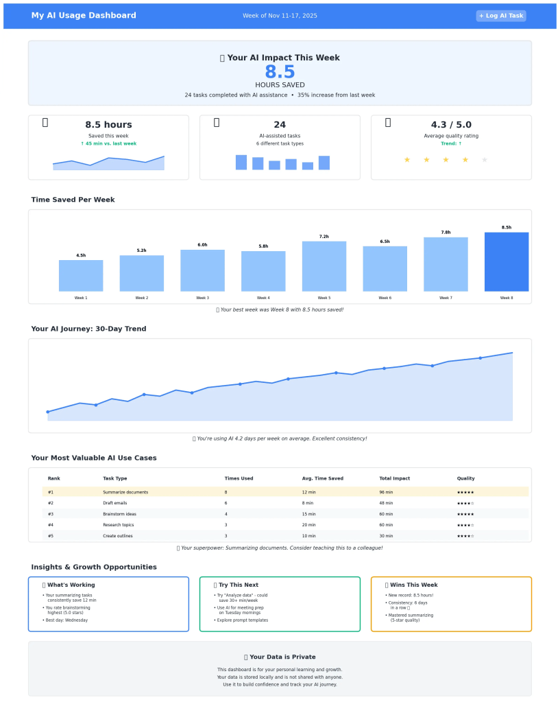 And to keep them motivated, show them simple numbers like time saved or improved clarity using a basic usage dashboard. But hold your horses, keep it extremely simple. You don’t need fancy analytics. The goal is to give people a quick, motivating snapshot of the value they’re getting from AI.