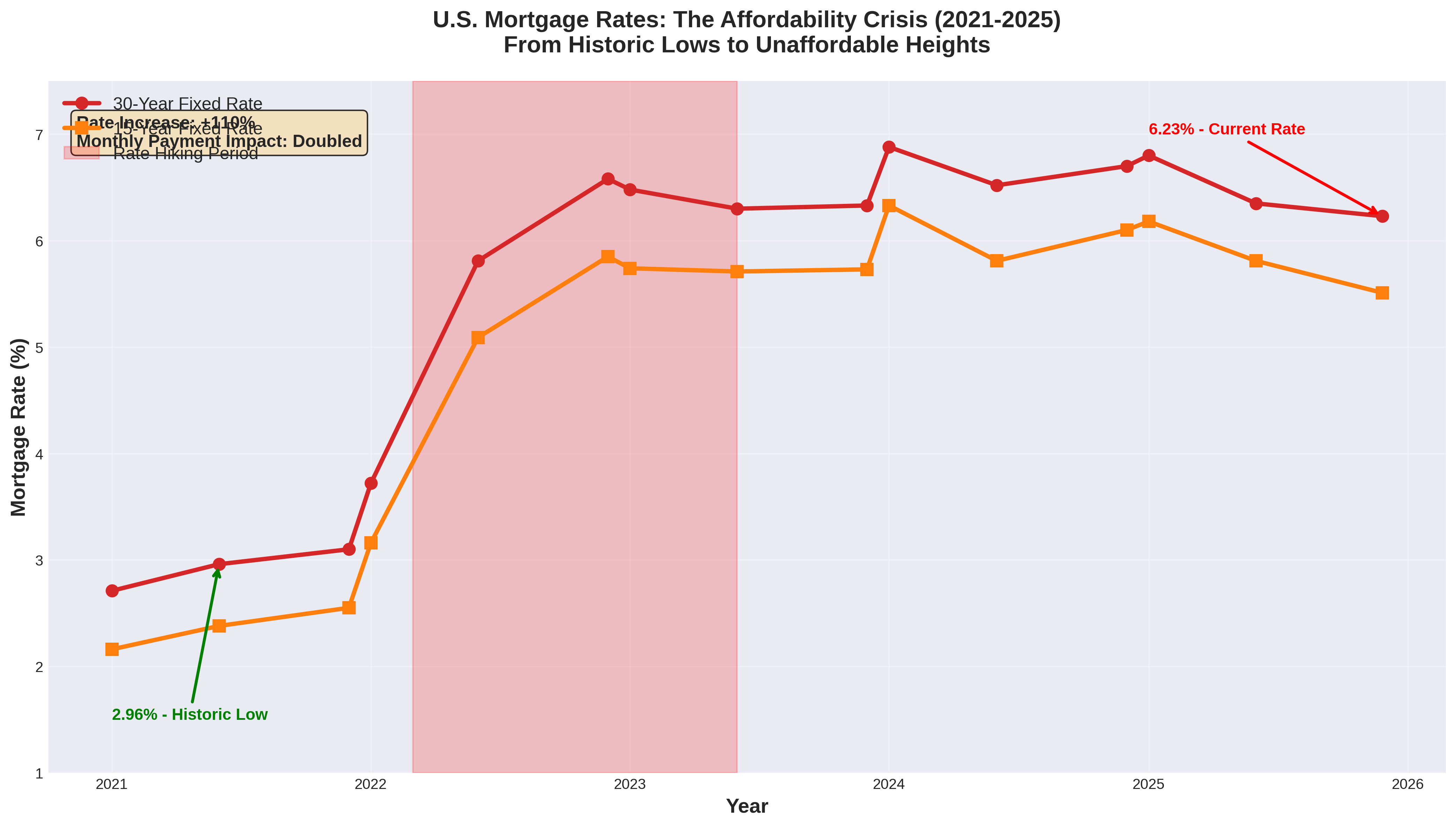 Mortgage rates that averaged 2.96% in 2021 are now slamming into the 6.2–6.3% range in 2025. The average family went from “maybe we can afford this” to “guess we’re gonna have to rent now”. Freddie Mac’s archive (just Google it), explains it with all the emotional warmth of a morgue report, that mortgage rates doubled, home affordability went down the pipe, and people are forced back into renting (maybe permanently).