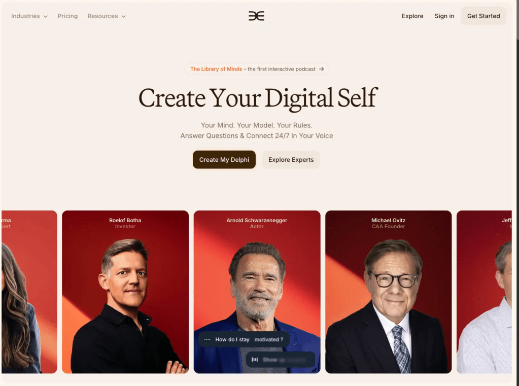 There’s Delphi that is positioning itself as a “verified digital cloning platform”, whatever that means. It sounds like something out of a sci-fi horror movie but is apparently a real product that real people use. They’re backed by Sequoia Capital (because of course they are), and they’ve attracted some seriously high-profile users like Arnold Schwarzenegger who now has a digital clone on Delphi, and he can hear himself say “Get to the choppa!” over and over again.