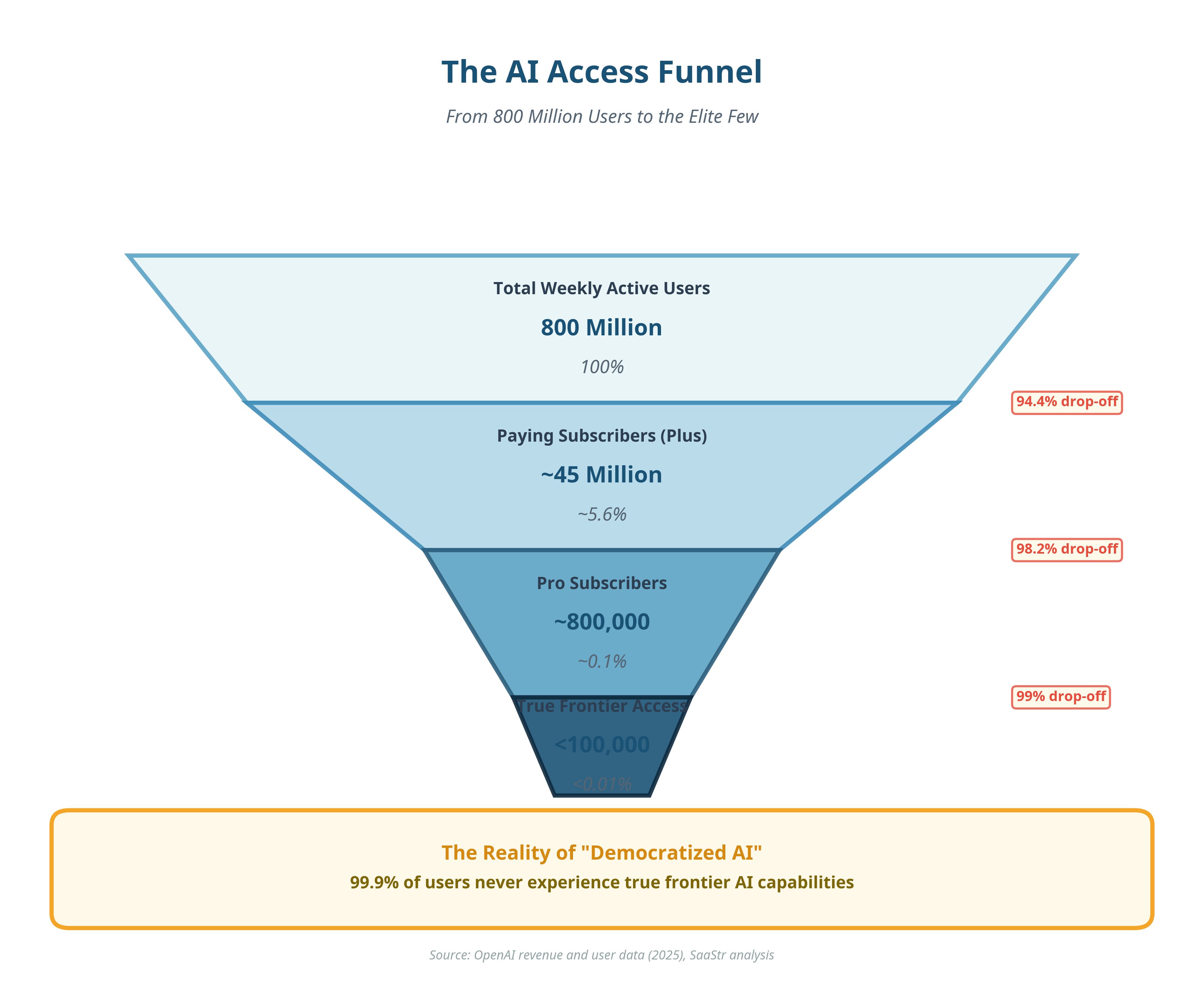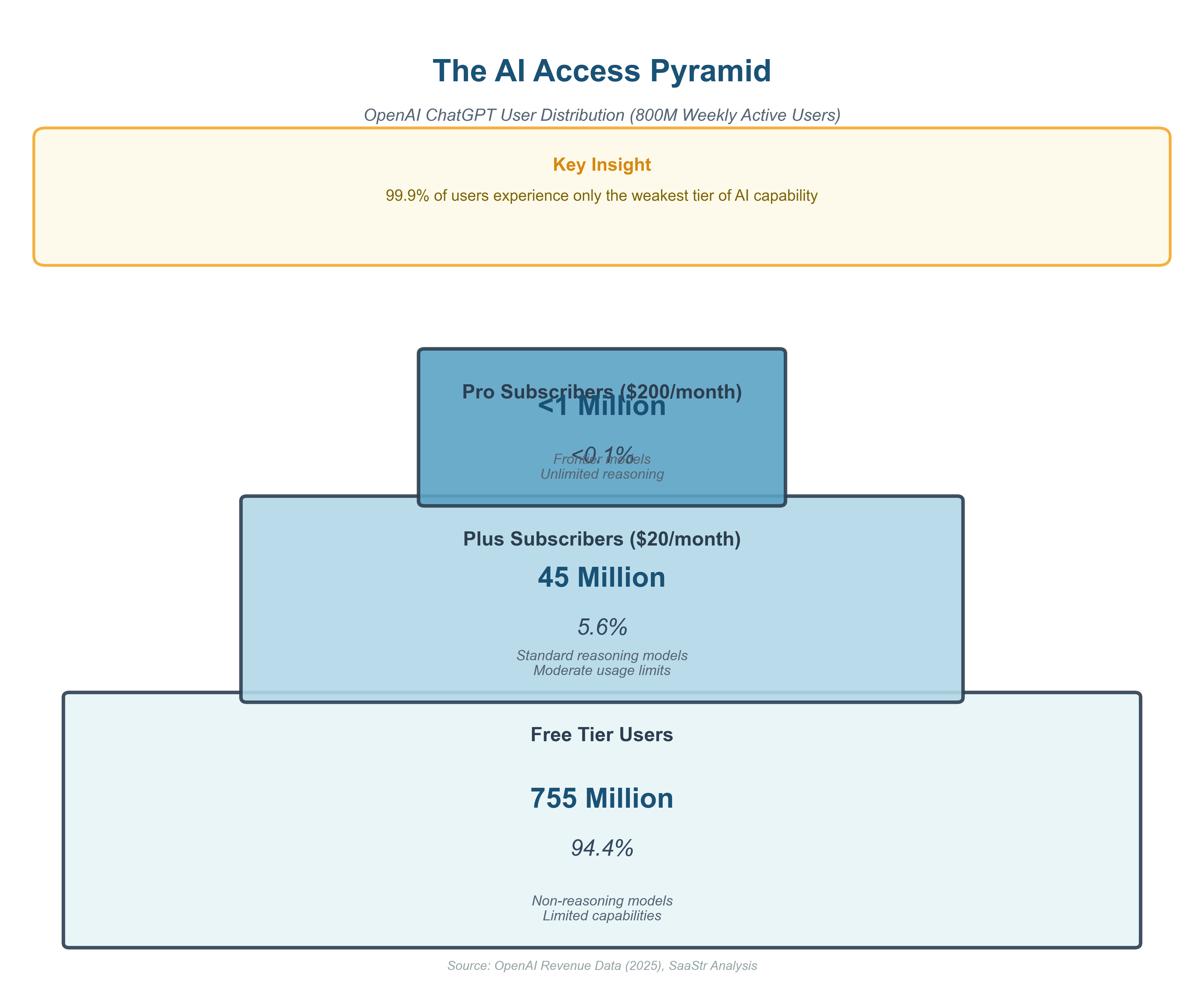 Even among paying users, only a tiny fraction pay $200 per month for ChatGPT Pro, which unlocks access to true frontier systems.
