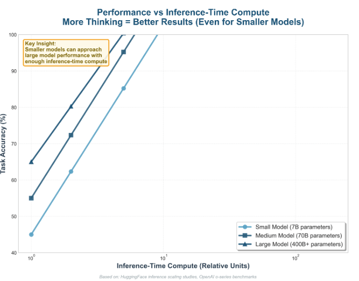 Data from open benchmarks shows that even relatively small models can approach the performance of much larger ones if they are allowed to run longer or try multiple solution paths. Intelligence, in practice, can be brute-forced with enough compute.