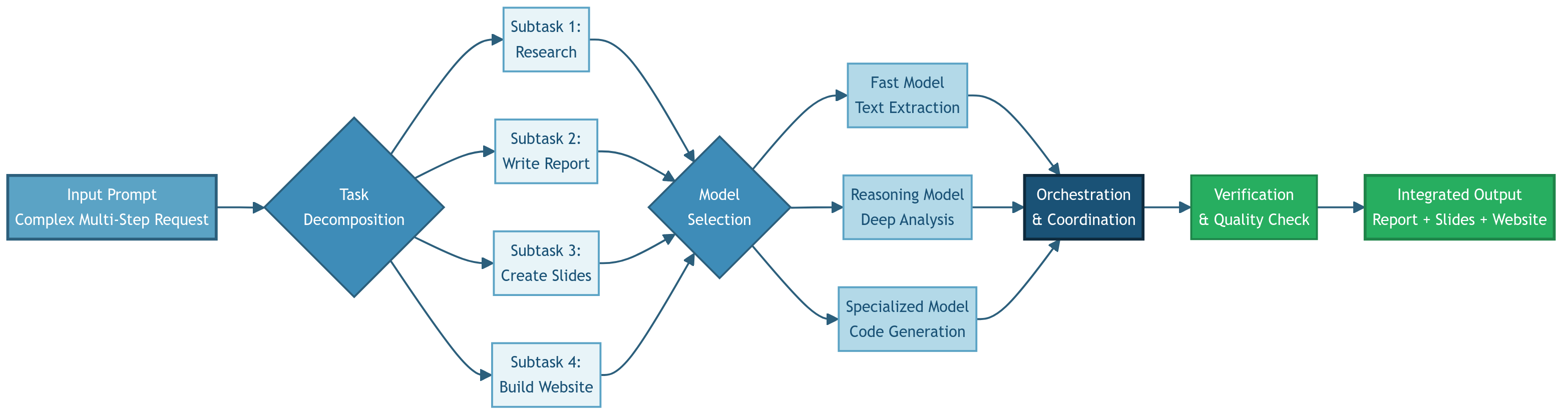- It then decides which classes of models are best suited for each subtask. Smaller, fast models for simple text extraction, to larger, reasoning-heavy models for deep synthesis and planning.