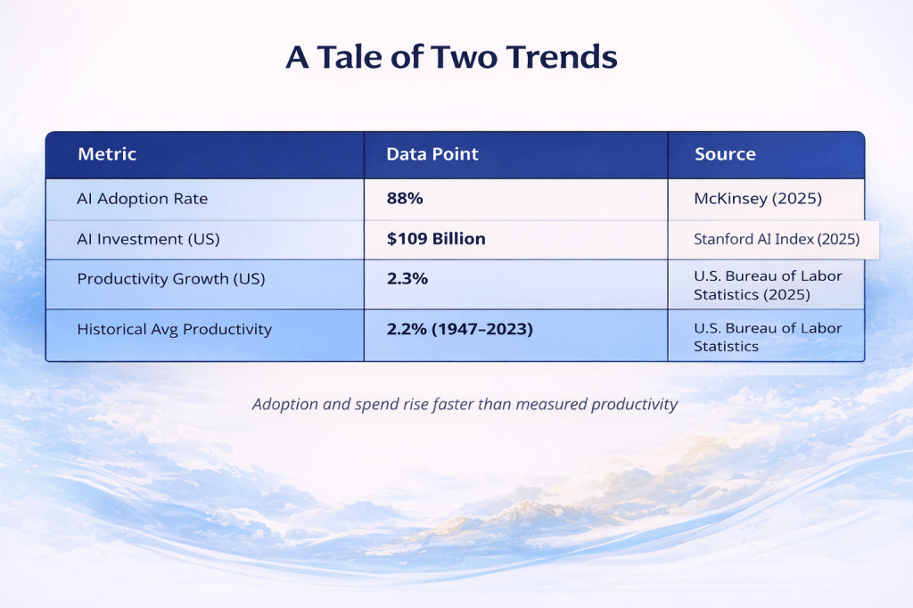 In this table you can see that AI usage is high (88% of organizations reporting AI use), spending is enormous (illustrative headline investment figures like $109B in the U.S.), and yet measured productivity growth sits around the same historical neighborhood (around 2.3% versus a long-run average of ~2.2%). That gap is the whole plot. The inputs and hype signals are quite visible, yet the output signal is calm, and everyone pretends the calm line is just “early days” instead of admitting that value is either delayed, or never operationalized in the first place.