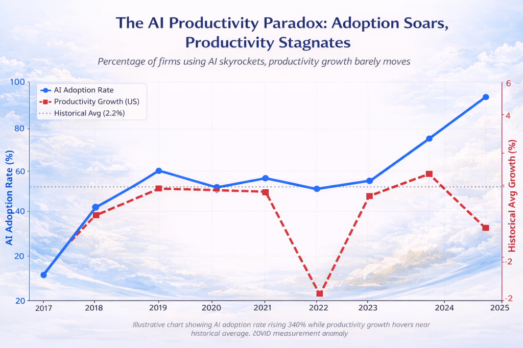 So if AI adoption is rising and pilots are “going live,” why does productivity still look like it’s taking a nap in the lactation room?