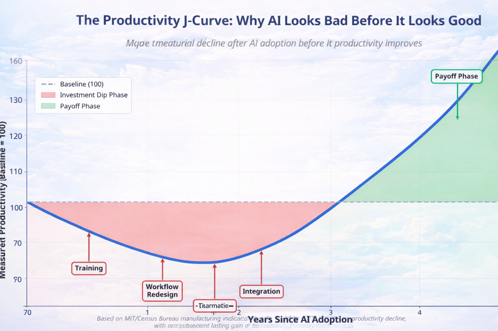 After AI adoption, measured productivity often drops first because companies spend time and money on the boring prerequisites like training and other kinds of “integration” annex “adoption”. That “dip phase” is the investment hangover where work gets disrupted and verification increases. Once those complementary pieces mature, the “payoff phase” kicks in and productivity climbs above the baseline as redesigned workflows start running end-to-end.