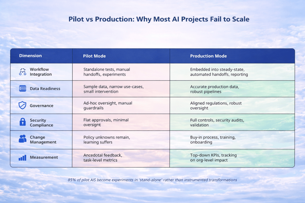 In pilot mode you can survive on loose assumptions. Data is messy, ownership is unclear, security is “later”, and success is measured by people saying it feels faster, but in production mode the AI has to live inside real workflows. It needs clean data, guardrails, monitoring, compliance, and outcomes you can measure without wishful thinking