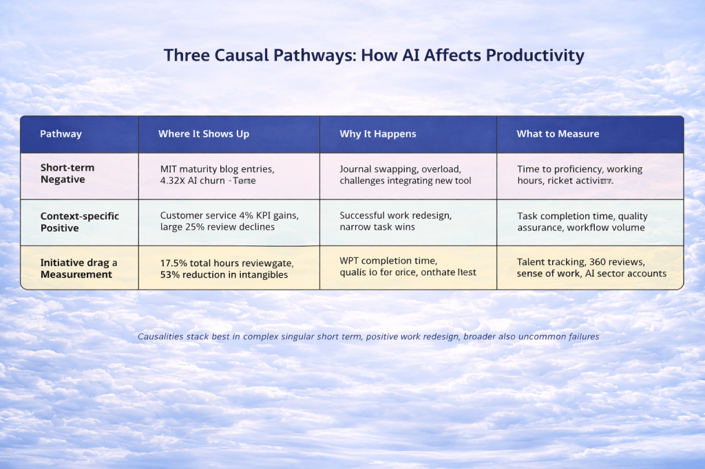 One pathway is the short-term negative effect pathway. This is where AI lands in a company like a meteor made of subscription invoices and sudden process interruptions, and the organization spends months or years building the boring support structure like training, governance, data cleanup, access controls, integration, change management, and the thousand tiny “why does this not work in our environment” problems. And during that time productivity can dip or stall because you’re paying the cost of change before you earn the benefit, and the only people who feel “faster” are the ones generating more text, which is the easiest kind of fake speed to produce.