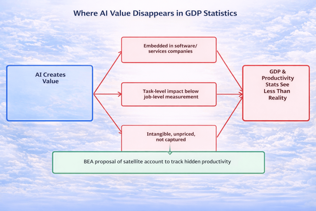 The Bureau of Economic Analysis has proposed a thematic satellite account approach to isolate AI-related production and investment more explicitly. What they mean is their main dashboard is not capturing this properly, so they need a separate dashboard just for this thing. Until measurement upgrades like that become standard, a lot of the signal stays buried.