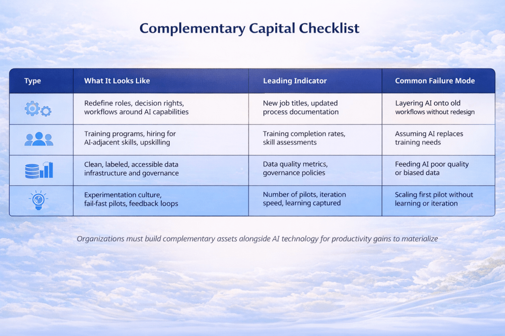 So the real lesson is that complementary capital is the real product, and the AI tool is just the accessory. if you don’t build the org, people, data, and learning machinery around it, you won’t get productivity, just a new cost line item.