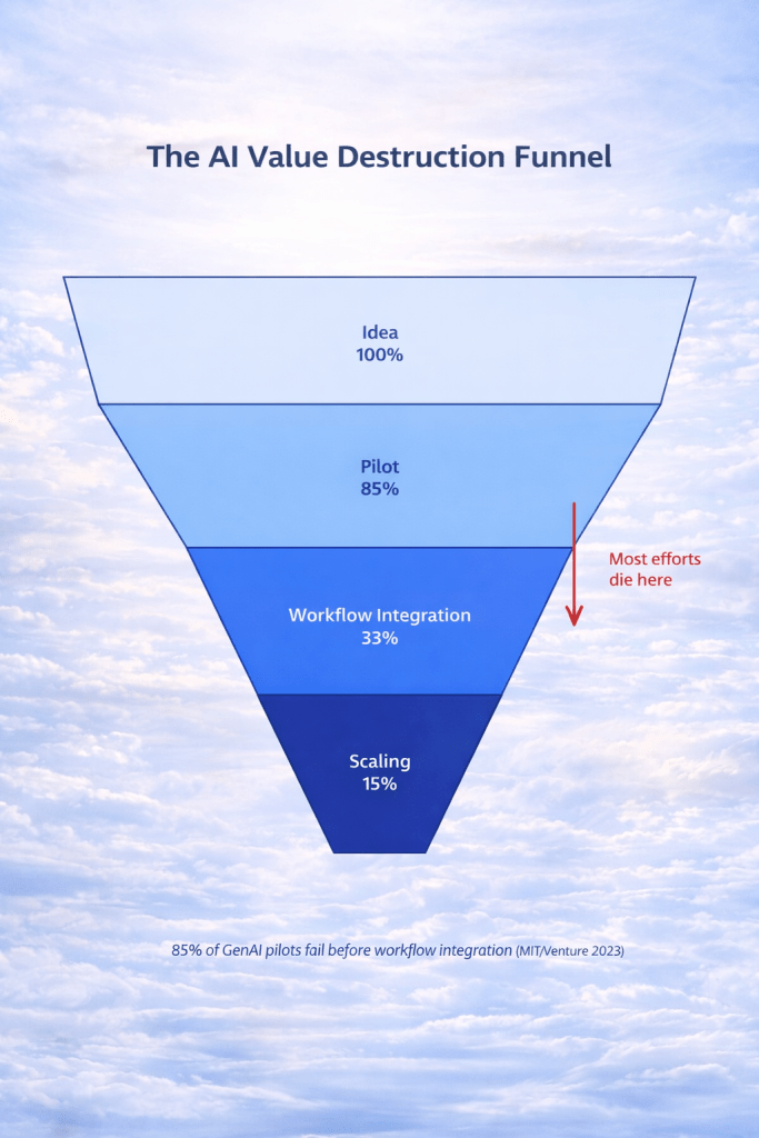 It starts wide with “ideas” and “pilots,” because ideation is cheap and optimism is basically a renewable resource. But the moment the work has to be integrated into real workflows, the funnel collapses. That middle section is where most initiatives die because the organization refuses to do the unsexy parts like data cleanup, access rules, compliance, ownership, change management, and the awkward conversation where someone has to admit the current process is garbage.