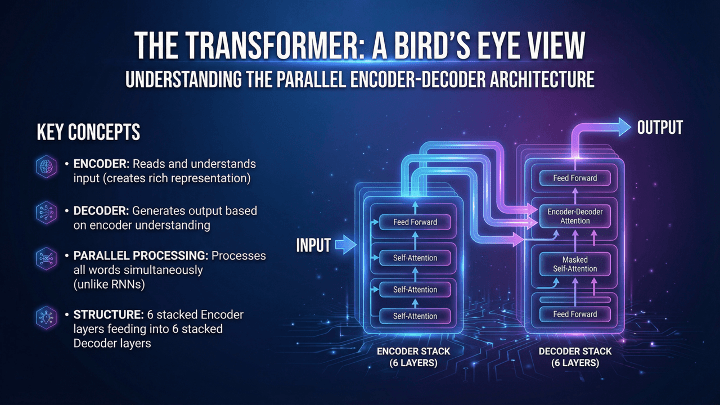 “Create a 12-13-slide teaching deck explaining the Transformer architecture to beginners. With beautiful visuals. Include a high-level architecture, embeddings, positional encoding, self-attention, multi-head attention, feed-forward layers, residuals, layer norm, and output projection. One diagram per slide. Add one worked mini-example of attention with small matrices. End with 5 comprehension questions that even my Weiner can understand.”